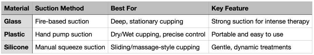 Cupping therapy can be performed using various types of cups, with glass, plastic, and silicone cups being the most common. While they share the same purpose of creating suction to improve circulation, each material offers unique benefits and is suited to different techniques.