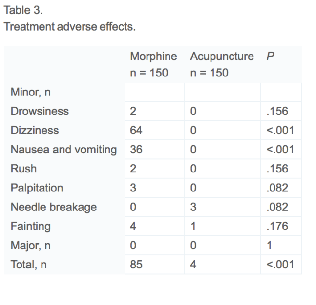 Overall, 89 patients (29.3%) experienced minor adverse effects: 85(56.6%) in morphine group and 4 (2.6%) in acupuncture group; the difference was significant between the 2 groups (Table 3). The most frequent adverse effect was dizziness in the morphine group (42%) and needle breakage in the acupuncture group (2%). No major adverse effect was recorded during the study protocol. (See Table 4.)”
